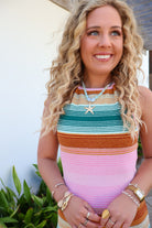 Featuring soft knit fabric with horizontal stripes in pink, green, rust, and cream, this halter dress hugs in all the right places while still being incredibly comfortable. The adjustable tie at the neckline creates a flattering halter shape and gives you that beautiful open-back detail.