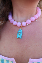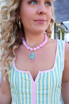 pink beaded necklace, adjustable charm necklace, boutique statement jewelry, colorful summer necklace, women’s trendy jewelry, vacation jewelry accessories, spring statement necklace, turquoise charm necklace, removable charm necklace