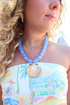 shell pendant necklace, blue beaded necklace, coastal statement jewelry, scallop shell necklace, beach vacation jewelry, boutique summer necklace, resort wear accessories, spring break jewelry