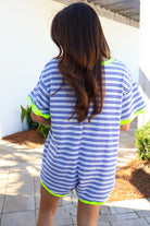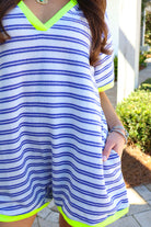 The striped body keeps it playful, while the contrast V-neck trim and sleeve hem give it that extra pop that makes it feel styled instead of basic. The boxy cut gives you that effortless drape (without clinging), and the relaxed shorts length keeps it comfortable and easy to move in.