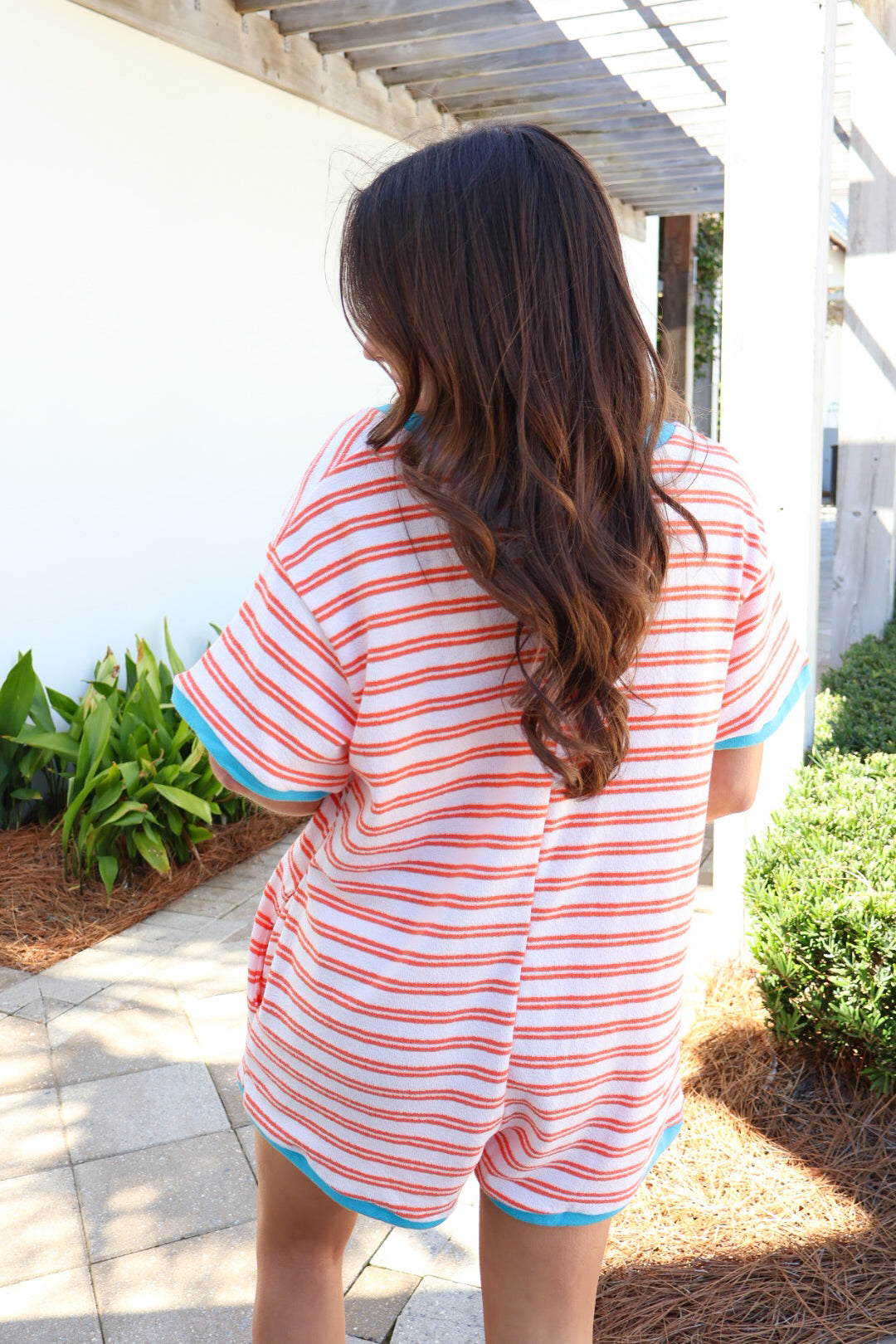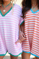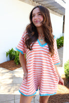 The striped body keeps it playful, while the contrast V-neck trim and sleeve hem give it that extra pop that makes it feel styled instead of basic. The boxy cut gives you that effortless drape (without clinging), and the relaxed shorts length keeps it comfortable and easy to move in.