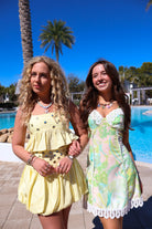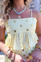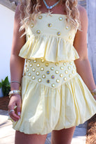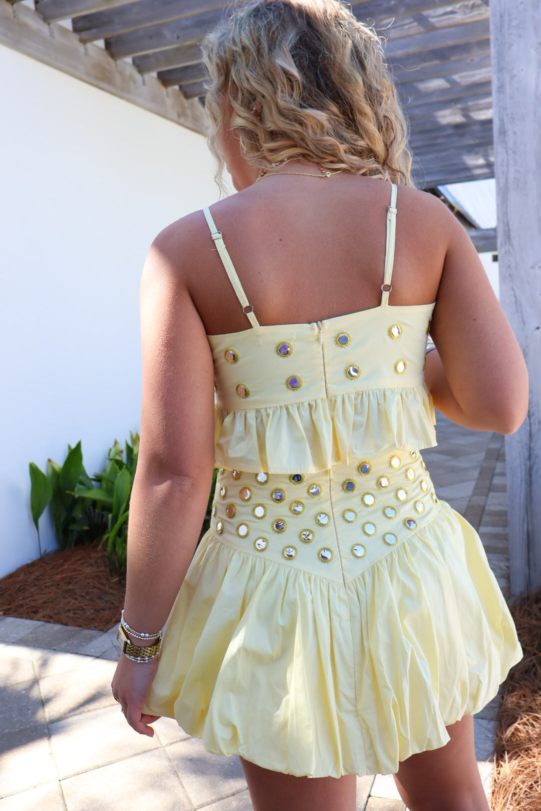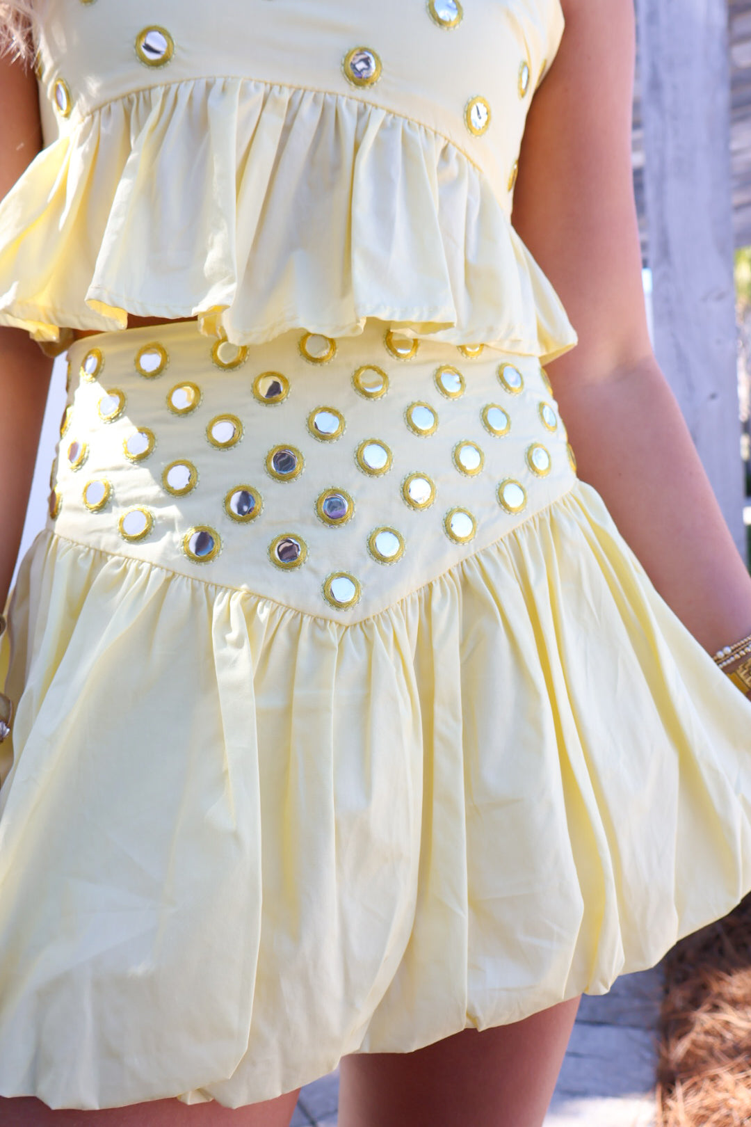 Yellow vacation set, spring break outfit, embellished yellow set, mini skirt set, summer skirt set, fun vacation outfit, women's summer outfit set, summer party outfit