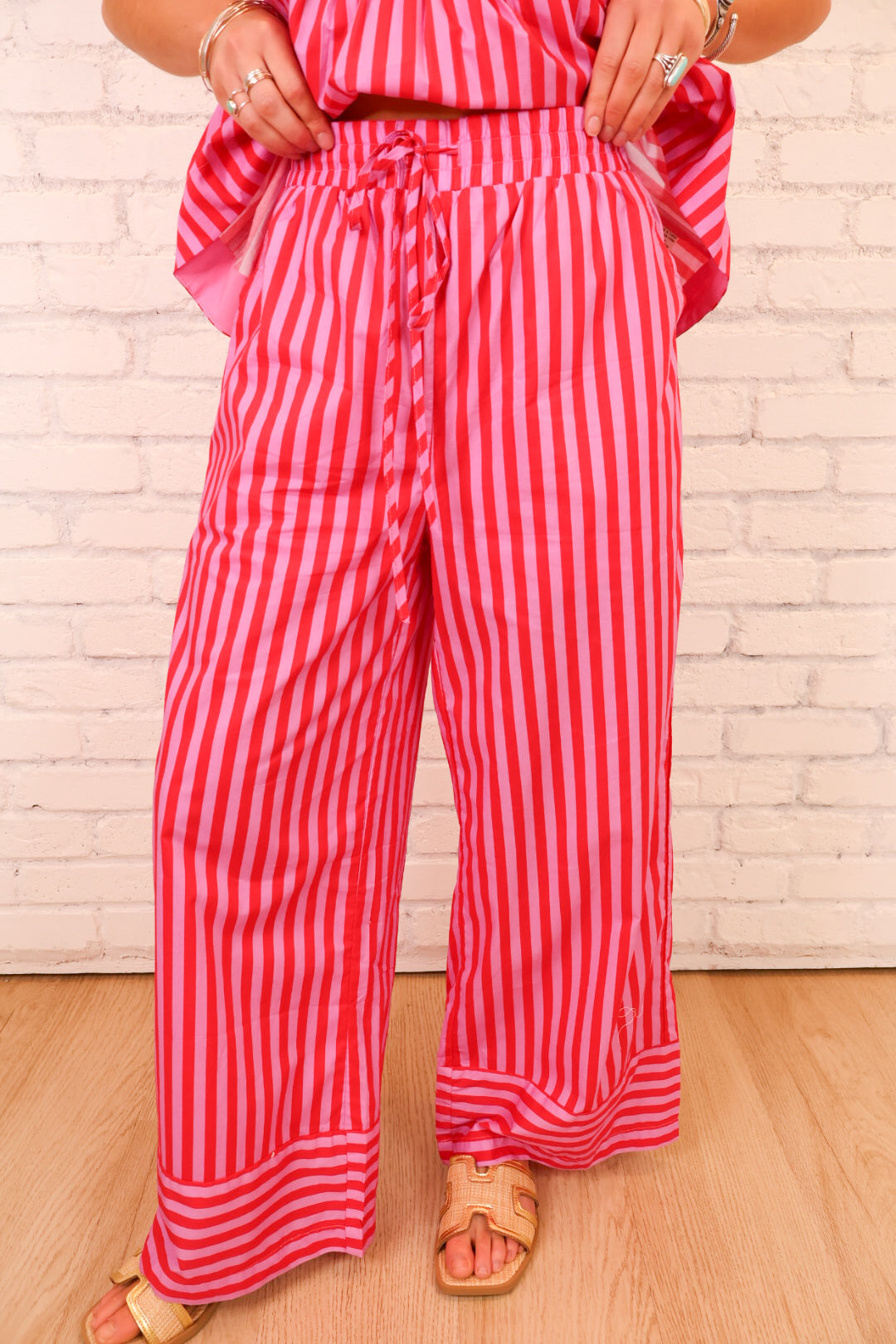 The coordinating wide leg pants are just as good. They feature a functional drawstring waist, partial lining for coverage, and an easy, relaxed silhouette that moves beautifully when you walk. The vertical stripe elongates the legs, and the contrast stripe detail at the hem gives it that little extra boutique feel.