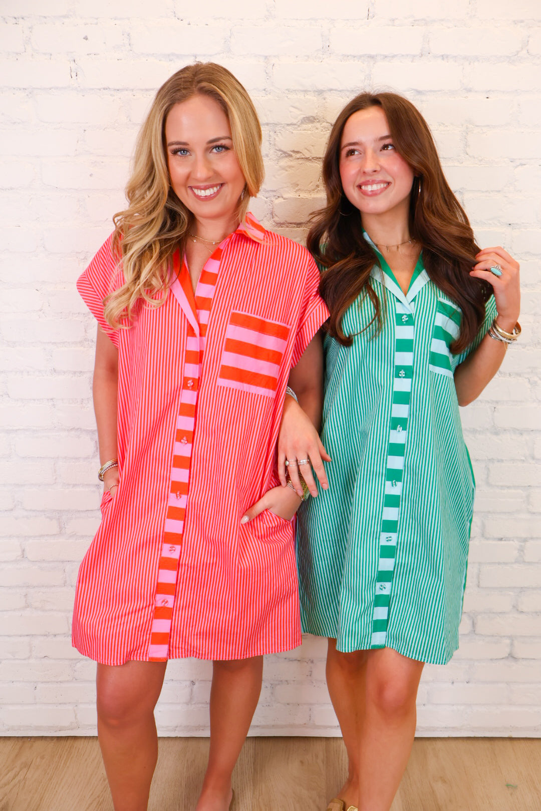 striped shirt dress, women’s button down dress, colorful striped mini dress, boutique shirt dress, casual summer dress with pockets, mixed stripe dress, collared striped dress, vacation shirt dress, women’s everyday dress