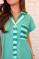 Our Mixed Stripe Button Down Shirt Dress is playful, polished, and surprisingly versatile! Designed with vertical stripes throughout and contrasting horizontal stripe details along the placket and chest pocket, this dress gives you that eye-catching moment without trying too hard.