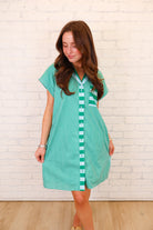 The collared neckline and full button front give it that classic shirt dress feel, while the relaxed silhouette keeps it comfortable enough for everyday wear. It features cuffed short sleeves, side pockets (always a win), and a lightweight woven fabric that feels breathable and easy!