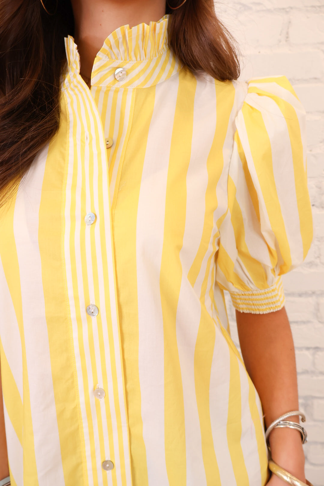 This yellow striped puff sleeve top is bright, cheerful, and full of personality. Featuring a button front design, puff sleeves with smocked cuffs, and vertical stripes, it’s such a fun way to add color to your everyday wardrobe.
