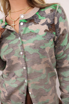 Bring on the cozy with this soft knit camo cardigan — your new go-to for coffee runs, casual days, and everything in between! The muted green and taupe tones give a fresh twist to a classic pattern, while the button-front detail makes it perfect for layering. Whether you’re pairing it with denim or tossing it on with your favorite lounge pants, it’s that effortless “off-duty but still put-together” look we all love.
