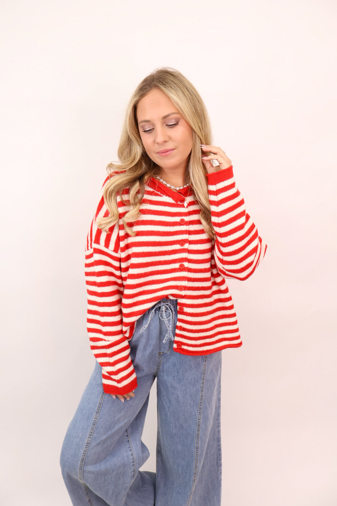women’s cardigan, button front cardigan, lightweight cardigan, everyday cardigan, layering cardigan, casual women’s sweater, spring cardigan, boutique cardigan, red striped cardigan, coastal striped cardigan