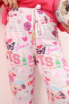 Snuggle up in style with our Swiftie glitter pajama pants! These comfy pants are printed with fun swiftie designs on a glitter background, perfect for any Swiftie. Relax in comfort while showing off your love for Taylor Swift. Enjoy a good night's sleep or a cozy day at home in these must-have pajama pants.