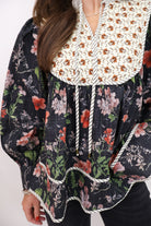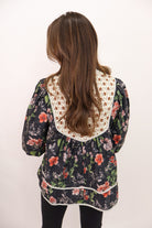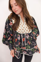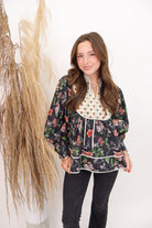 A true statement piece for fall — this black floral contrast collar top blends romantic charm with a bold, one-of-a-kind print mix. The black base features an allover floral pattern with pops of red and green, while the contrasting cream printed collar and trim add a fresh, vintage-inspired touch. The relaxed silhouette and lightweight feel make it an effortless pick for dressing up or down.