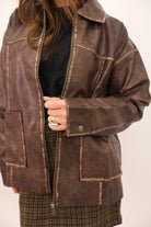 Give your look that effortlessly cool finish with our Vintage Edge Faux Leather Jacket! Crafted from a soft, worn-in vegan leather with subtle seam detailing, this jacket blends laid-back and luxe perfectly. Its relaxed fit and zip front make it easy to throw on over everything from cozy knits to floral dresses — the perfect piece for transitional weather and beyond!