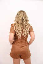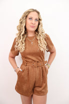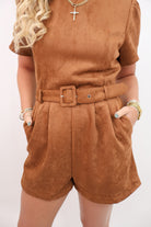 Elevated yet effortless, this faux suede romper is the perfect mix of chic and wearable! Crafted in a rich brown hue, it features a structured fit with short sleeves, a hidden back zipper for a seamless finish, and a removable belt that cinches the waist for a flattering silhouette. The luxe suede-like texture gives it that elevated touch while still being comfortable enough for all-day wear.