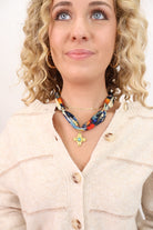This multicolor scarf necklace is a bold statement piece that brings both color and meaning to your look. The silky scarf features a mix of vibrant tones—perfect for adding life to neutral outfits—while the gold cross pendant adds a timeless, faith-filled touch.