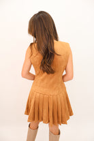 faux suede dress, camel fall dress, Thanksgiving outfit, pleated mini dress, neutral fall outfit