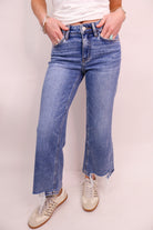 Meet your new everyday denim with just the right amount of edge! These Flying Monkey jeans feature a flattering high-rise fit with a subtle cropped flare that hits perfectly at the ankle. Finished with a raw hem, they bring an effortless, lived-in look that feels modern but still timeless.