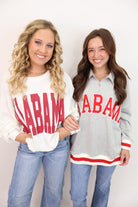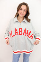 Game day comfort meets classic Crimson Tide style in this Alabama Appliqué Quarter Zip Pullover. Crafted from soft fabric, this oversized sweatshirt features a bold, stitched “ALABAMA” appliqué across the chest in standout crimson. The relaxed fit, zip neckline, and striped ribbed cuffs and hem give it that vintage-athletic feel we love — perfect for throwing on over leggings or denim.