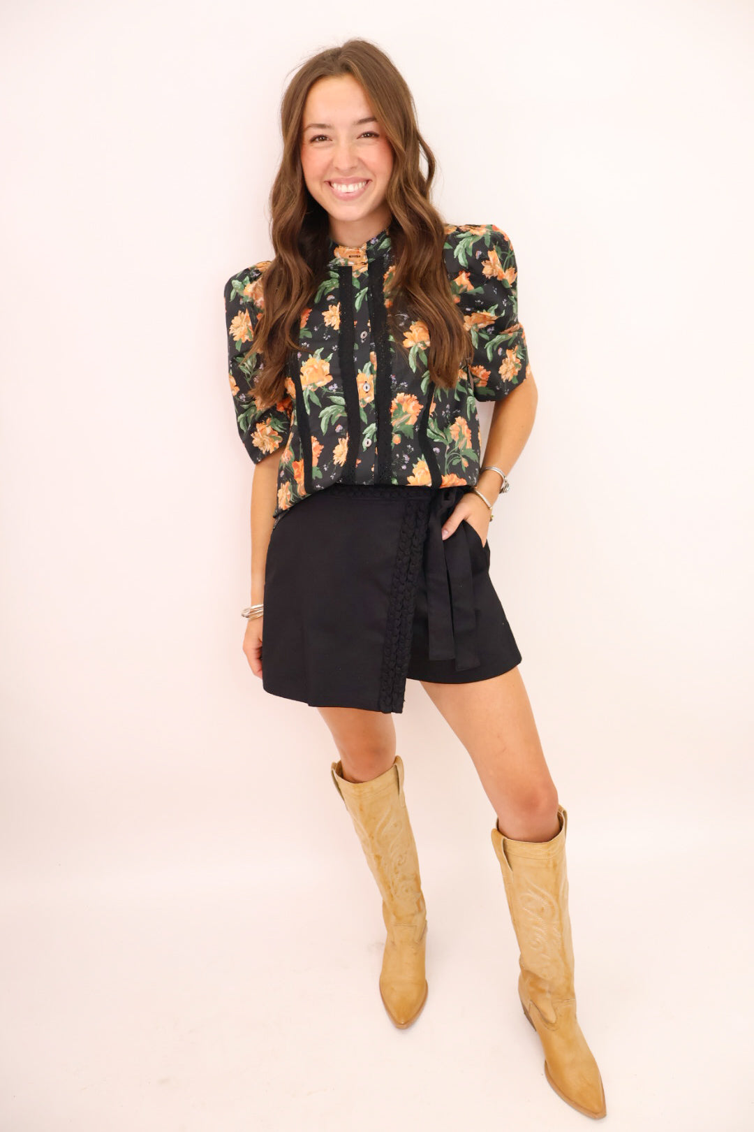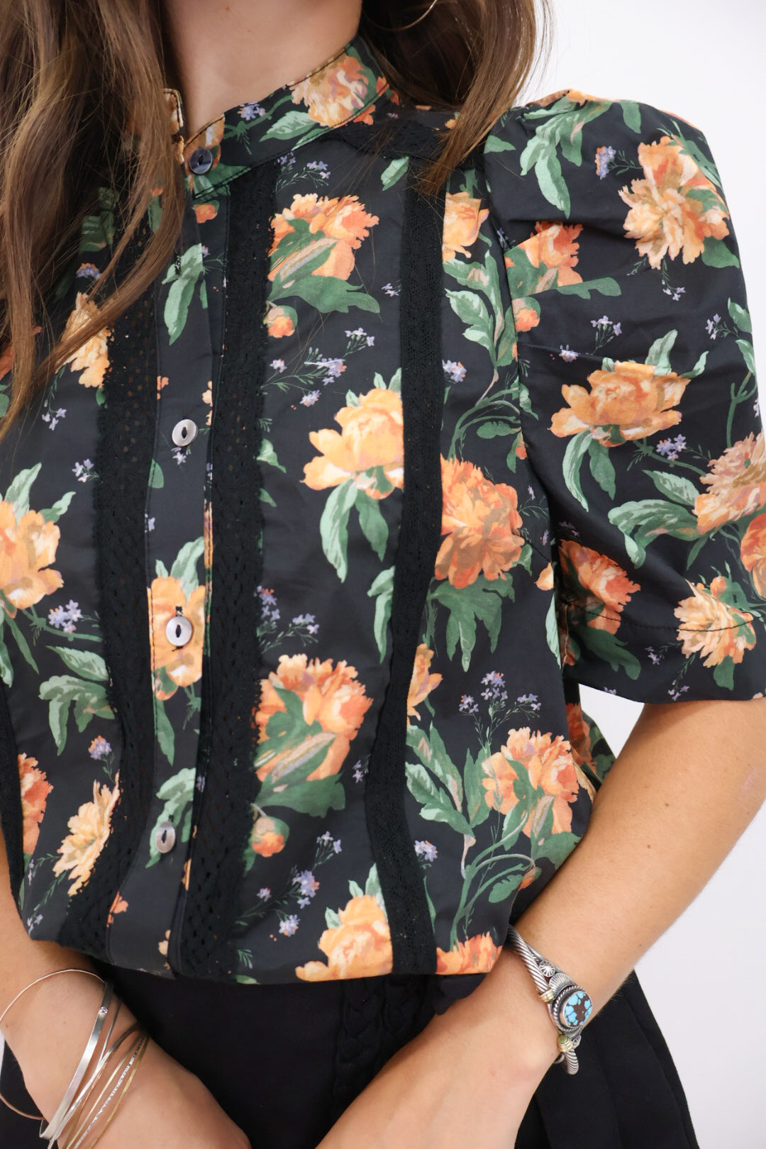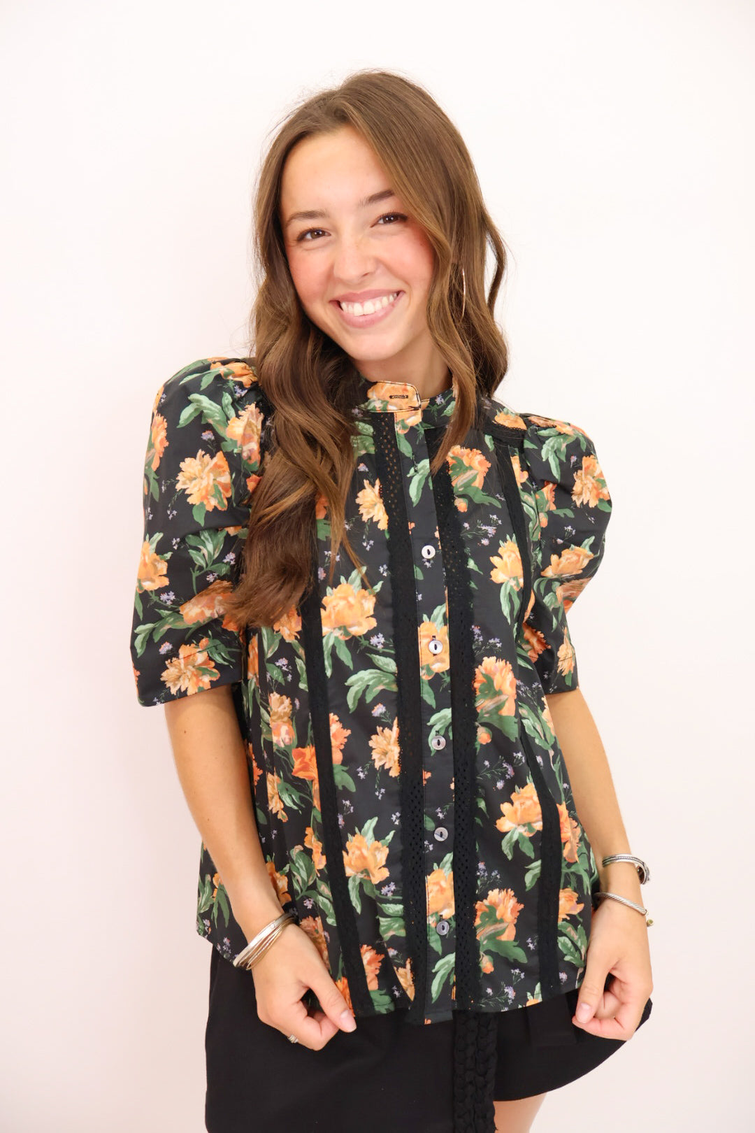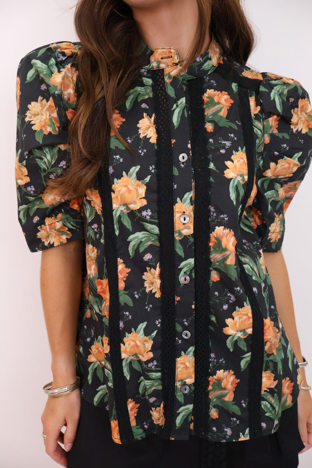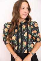 floral puff sleeve blouse, fall floral top, button-up blouse with lace trim, black floral shirt, boutique pre-fall fashion, elevated everyday top, romantic moody floral blouse