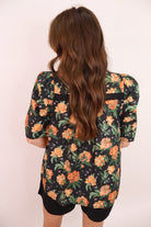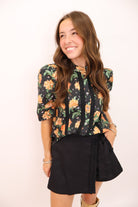 A little moody, a little romantic — the Midnight Marigold Button-Up is giving elevated garden party vibes with a touch of edge. This striking floral top features a black base with bold marigold blooms, delicate purple sprigs, and rich green leaves, making it a standout piece for pre-fall. The button-down front is trimmed with vertical lace ribbon detailing that adds beautiful texture and structure, while the puff sleeves and relaxed fit keep things feminine and easy to wear.
