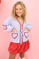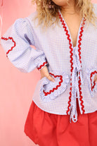 Elevate your style with our Blue Gingham Heart Tie Top! Made with a charming blue gingham print, this top features a front tie for a flattering fit. Accented with red ricrac trim and heart-shaped pockets, it's a must-have for adding a touch of love to any outfit!