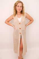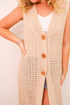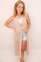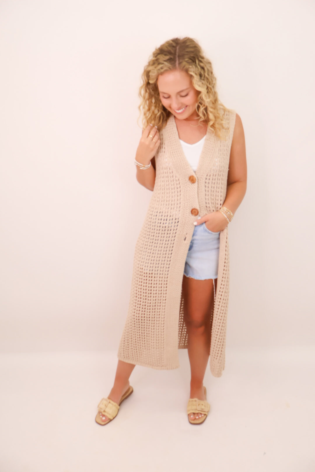 crochet knit duster, summer layering vest, lightweight cardigan, sleeveless knit duster, neutral beach cover up, button front vest for women, Memorial Day outfit idea, boho summer layers