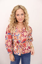 Bold, vibrant, and ready to make a statement — this multicolor floral tie-waist top is everything we love about fall dressing! The rich mix of rust, plum, and blue tones gives it that effortless boho feel, while the adjustable tie waist flatters your shape and adds a touch of structure. The lightweight woven fabric makes it easy to wear from day to night — whether you’re heading to brunch, the office, or a weekend getaway.