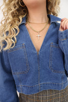 Meet your new closet staple with a twist—the Cropped Denim Long Sleeve Top! Designed in a medium wash denim, this top features a modern cropped silhouette with a relaxed fit, utility-inspired pockets, and a flattering V-neckline. It’s versatile enough to style casual with sneakers and joggers, or elevate with a plaid skirt and boots for a chic fall vibe. The soft yet structured denim fabric gives just the right amount of polish, making this piece a go-to for layering all season long!