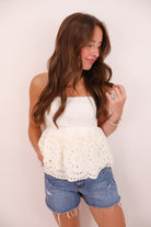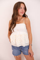 A little sweet, a little flirty—this top is Southern charm at its finest! Featuring intricate eyelet embroidery and a breezy peplum silhouette, it’s made for sunny days and sweet tea moments. The adjustable crisscross back with tie detail gives it that flattering fit we all love, while the scalloped hem adds just the right touch of femininity. Pair it with denim cutoffs and boots for a look that screams southern summer done right.