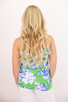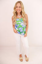 tropical floral tank top, green and blue floral print top, summer statement top, Palm Royale inspired top, coastal chic outfit, bold floral blouse, resort wear for women, printed vacation top, summer going out top, tropical blouse for women