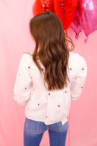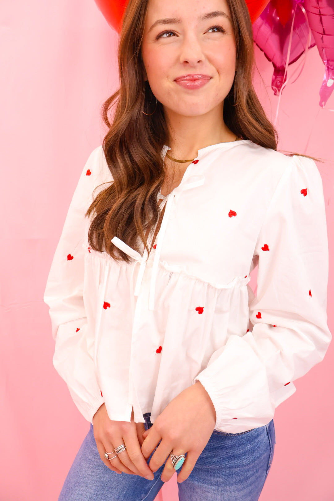 Fall in love with our white front tie heart top! Made with high-quality white poplin cotton and adorned with allover red embroidered hearts, this blouse will make you feel confident and stylish. The tie front detail adds a playful touch while the hearts add a touch of elegance. Perfect for any occasion, this top is a must-have in your wardrobe!