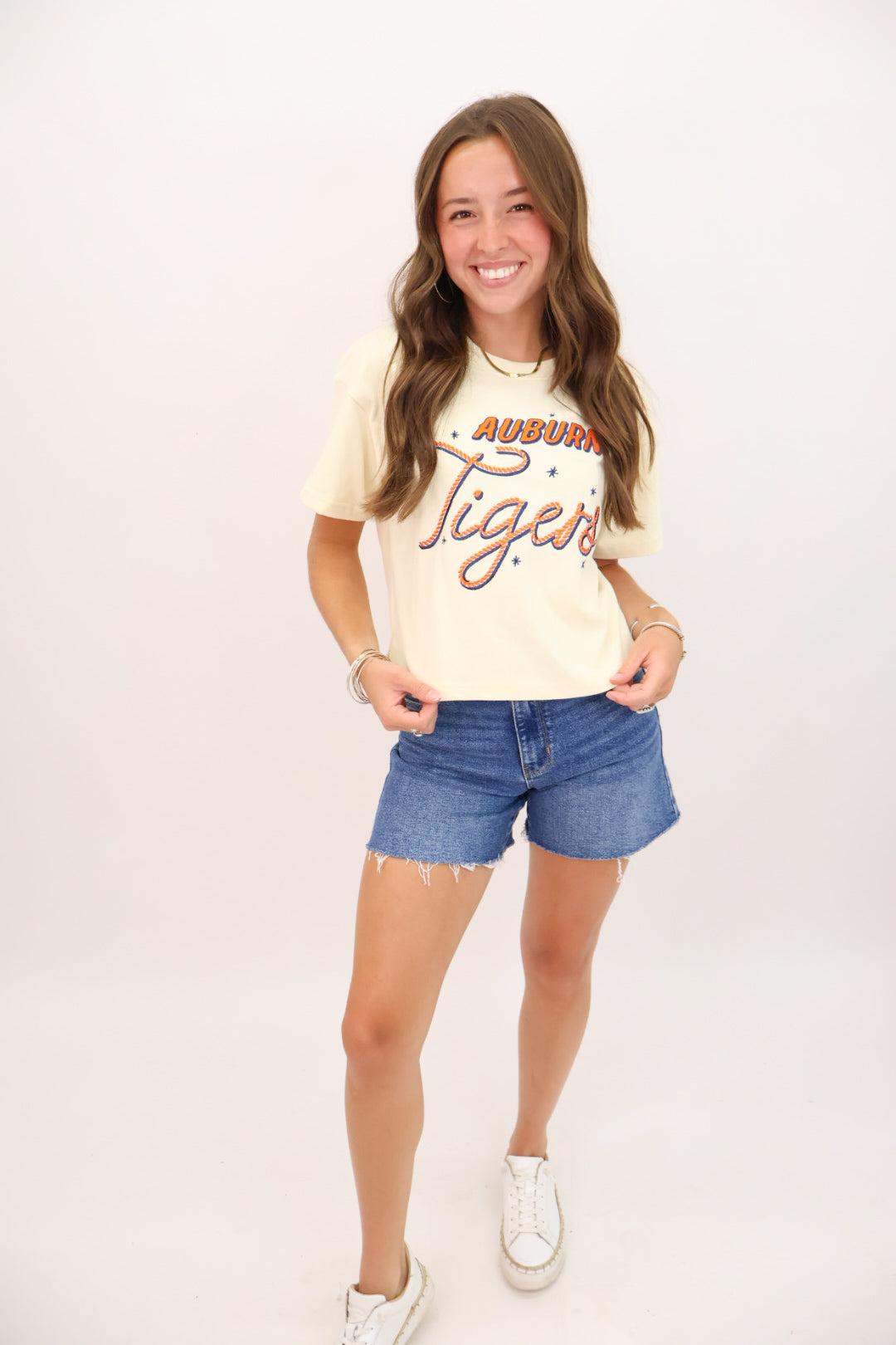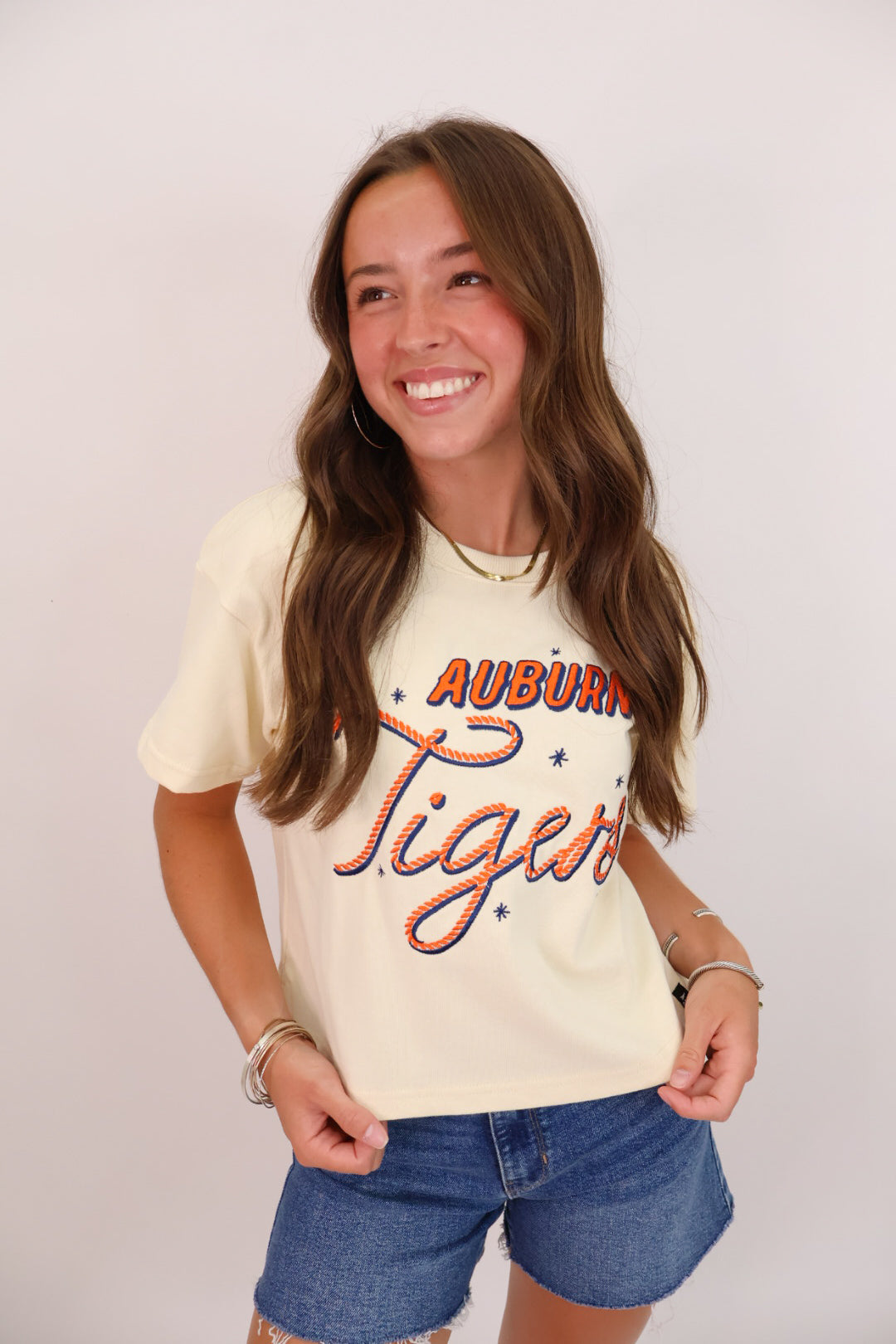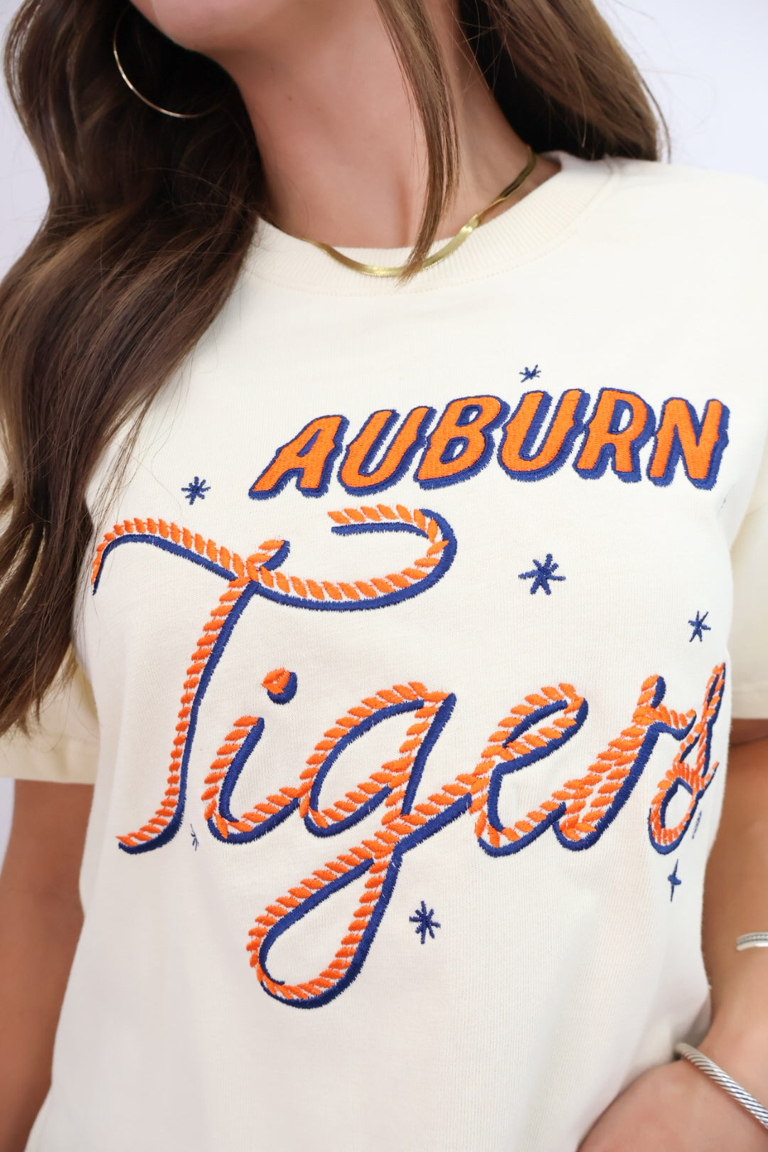 The tee your gameday lineup needs. This Auburn Tigers embroidered crop tee is sweet, sporty, and a total standout. The creamy ivory base sets the stage for bold orange and navy embroidered lettering, with playful stars and a rope-style script that gives a nod to vintage spirit wear. It’s cropped just right for high-rise denim or athletic skirts and designed in a soft, mid-weight cotton that keeps you comfy from tailgate to touchdown. Whether you’re heading to Auburn or repping from your couch, this one’s an easy favorite for the season.
