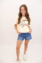 Style Tip: Pair with white denim shorts, sneakers, and a baseball cap for a classic gameday look — or layer it under a flannel for cooler kickoff nights.
