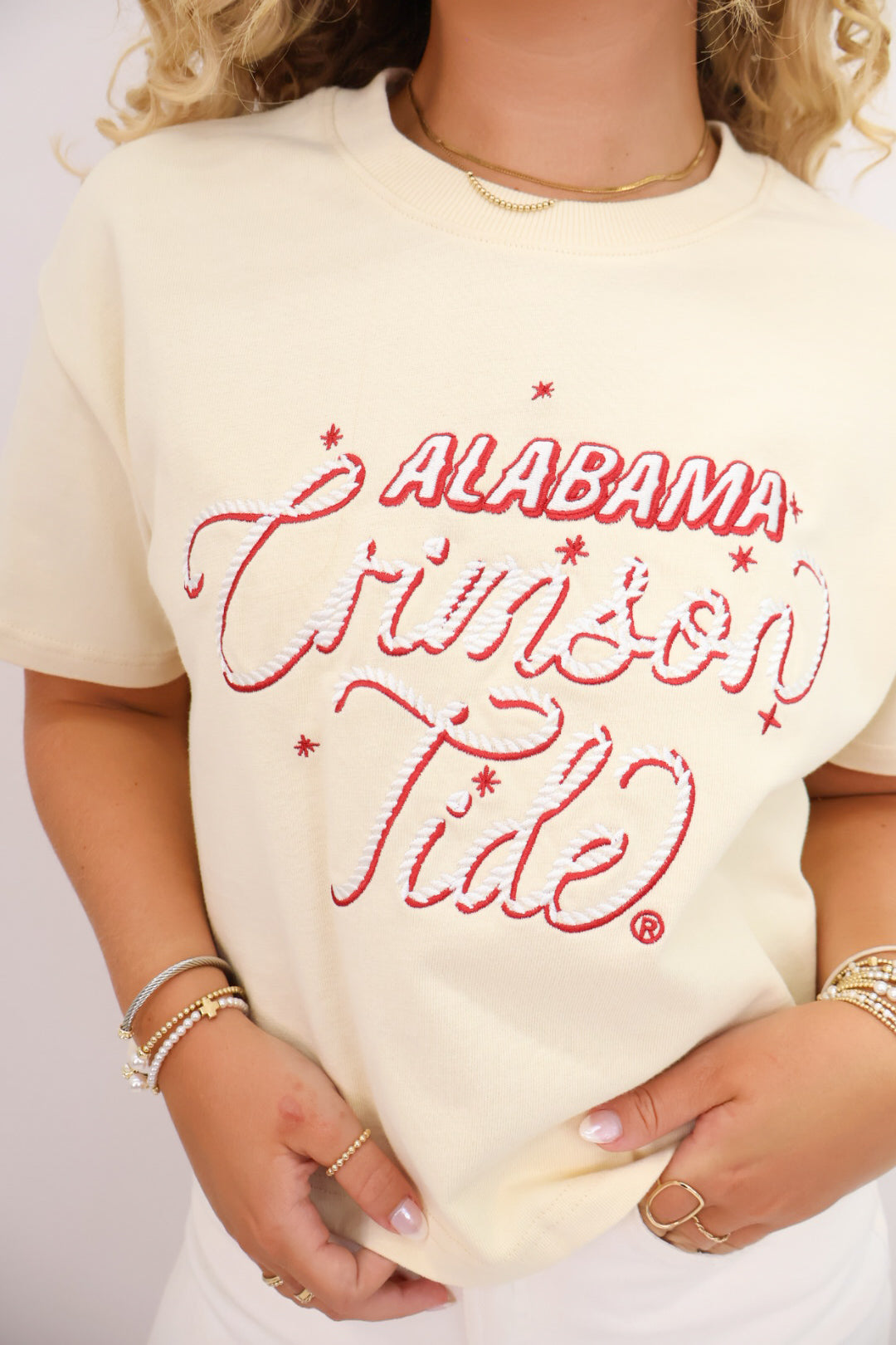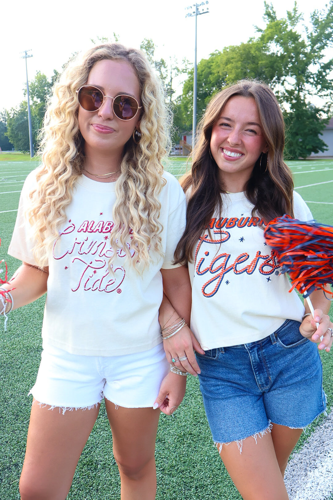 The tee your gameday lineup needs. This Alabama Crimson Tide embroidered crop tee is sweet, sporty, and a total standout. The creamy ivory base sets the stage for bold red embroidered lettering, with playful stars and a rope-style script that gives a nod to vintage spirit wear. It’s cropped just right for high-rise denim or athletic skirts and designed in a soft, mid-weight cotton that keeps you comfy from tailgate to touchdown. Whether you’re heading to Tuscaloosa or repping from your couch, this one’s an easy favorite for the season.