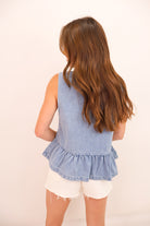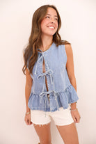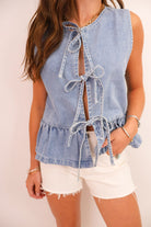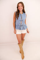 denim peplum vest, tie front denim top, summer concert outfit, western inspired vest, denim layering top, casual cowgirl style, boutique denim tops, country concert outfit inspo, sleeveless denim blouse