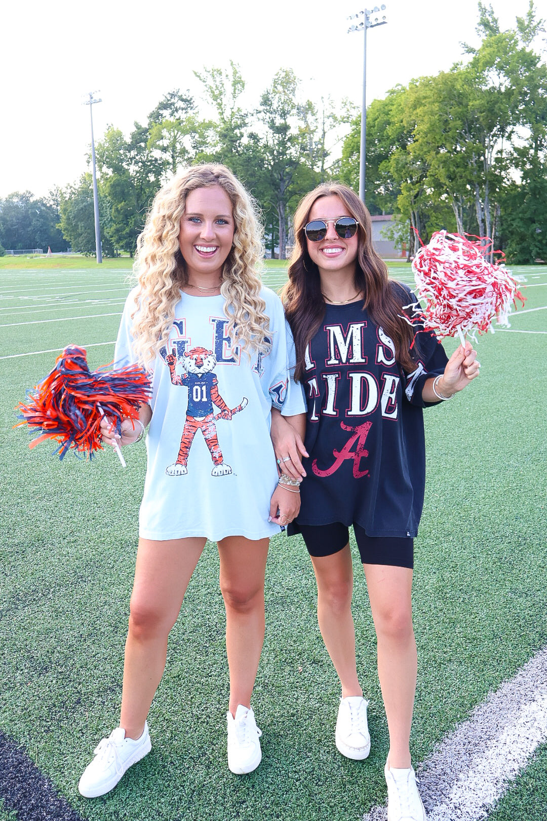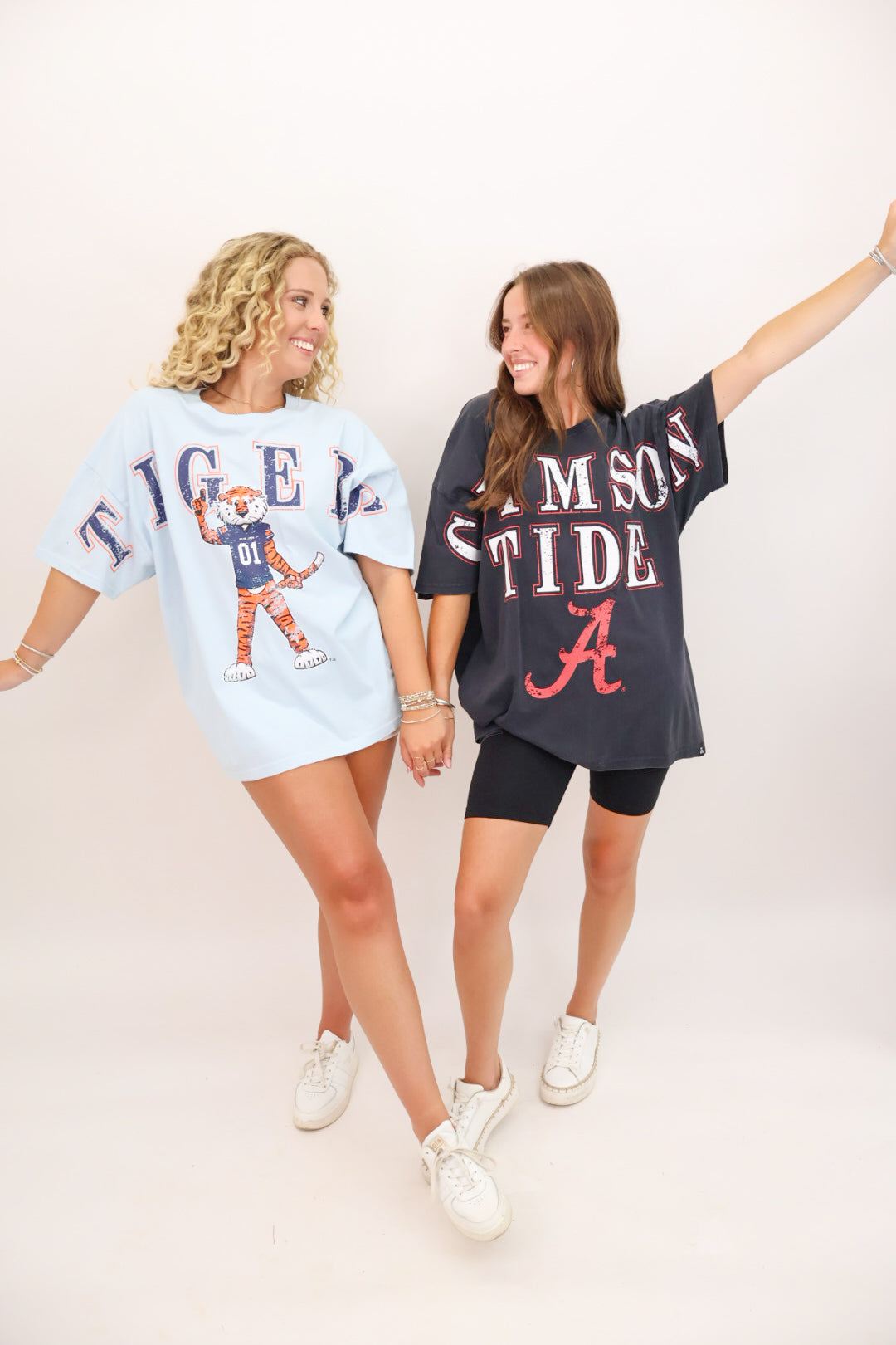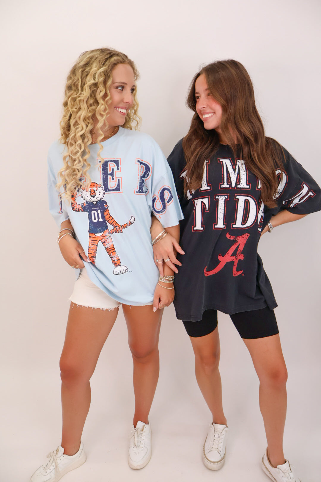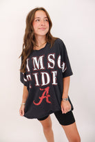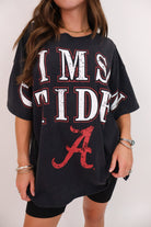Big game energy in one bold tee. This oversized black Crimson Tide graphic tee brings all the vintage vibes with its distressed lettering and bold Alabama “A” front and center. The relaxed fit makes it a go-to for Gameday Saturdays, early tailgates, and all the cozy Sundays after a win. Whether you’re pairing it with biker shorts and sneakers or knotting it over a denim skirt, this tee makes showing team spirit actually cute.
