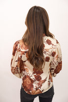 satin floral blouse, brown floral top, button front fall blouse, silky long sleeve shirt, elevated fall outfit
