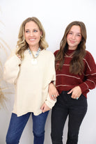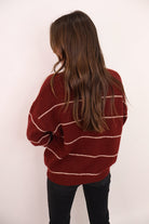 The coziest fall layer has arrived! This oversized burgundy sweater is designed with a relaxed fit and neutral cream stripes that give it just enough detail. With its longer length and easy silhouette, it’s the kind of sweater you’ll wear on repeat—whether you’re at a football game, curled up at the cabin, or running errands in denim and sneakers.