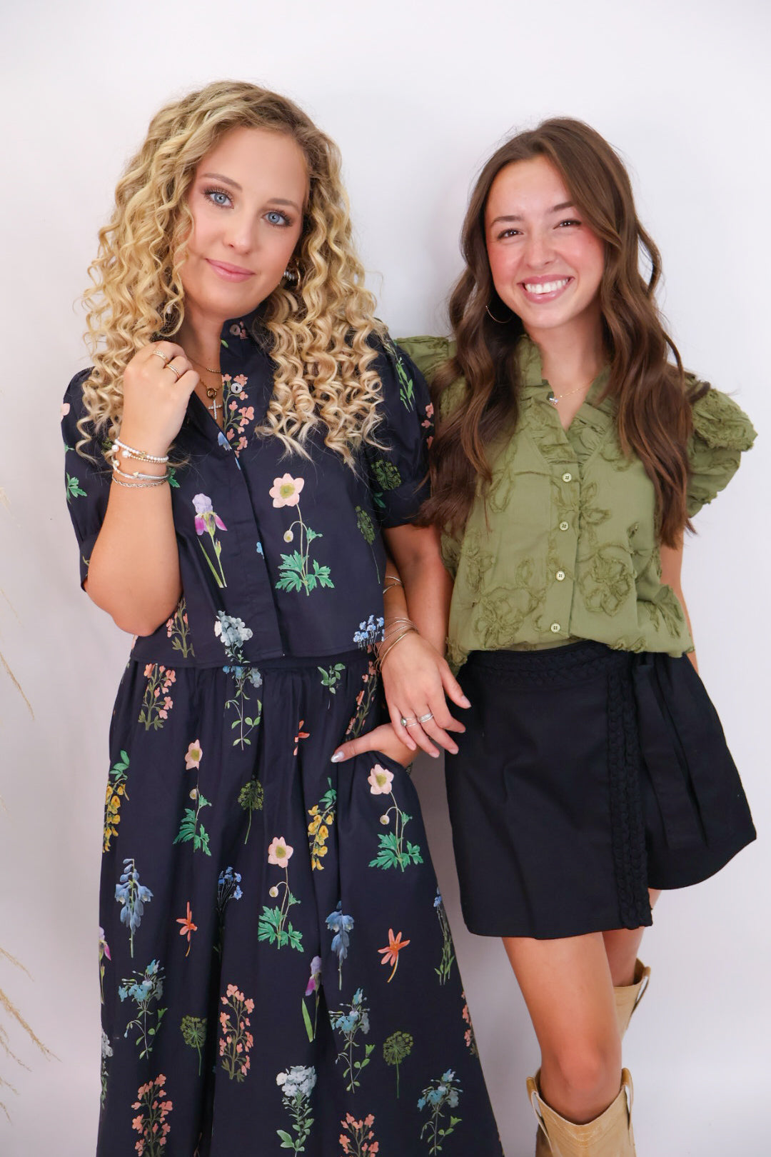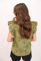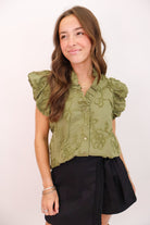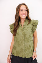 If fall had a color, this would be it! Our Textured Floral Ruffle Sleeve Top in Olive features a crinkled woven texture with raised floral details and ruffled cap sleeves. It buttons up the front with a flattering v-neckline and has just the right amount of structure to feel elevated while still being comfy enough for everyday wear. Tuck it into denim or style it with trousers — it’s a versatile go-to for the season ahead.