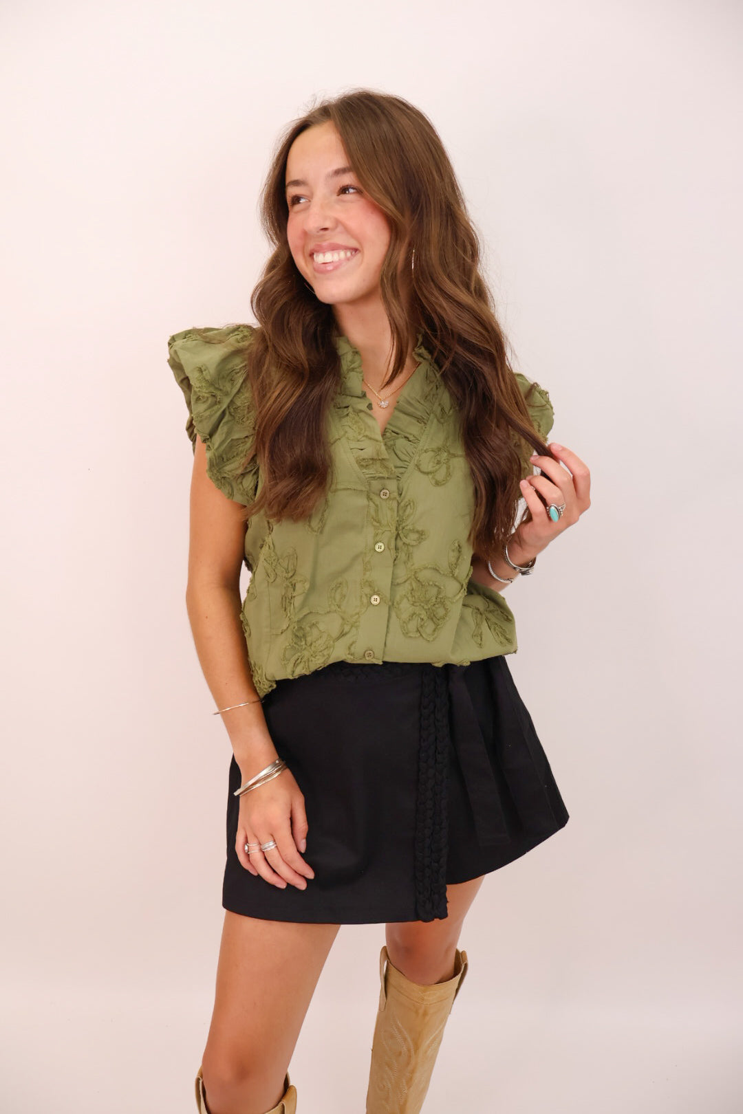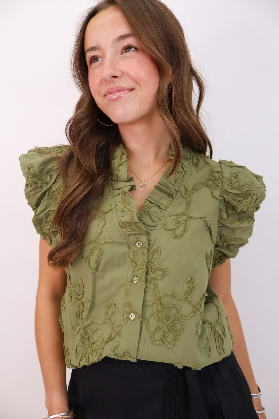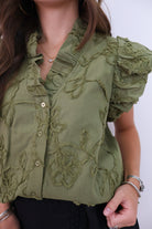 olive fall blouse, textured ruffle top, boutique button front top, short sleeve fall blouse, floral textured blouse, olive colored shirt, fall transitional top