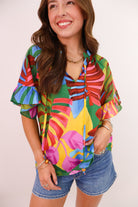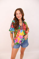 tropical vacation blouse, colorful printed summer top, tie neck leaf print blouse, lightweight resort wear, multicolor leaf print top, breezy tropical shirt, flutter sleeve island blouse, beach vacation outfit, travel-ready colorful top, The Destination Edit