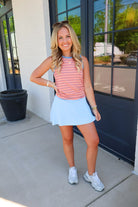 blue athletic skort, skort with built in shorts, everyday skort outfit, casual athletic wear women, boutique activewear skort