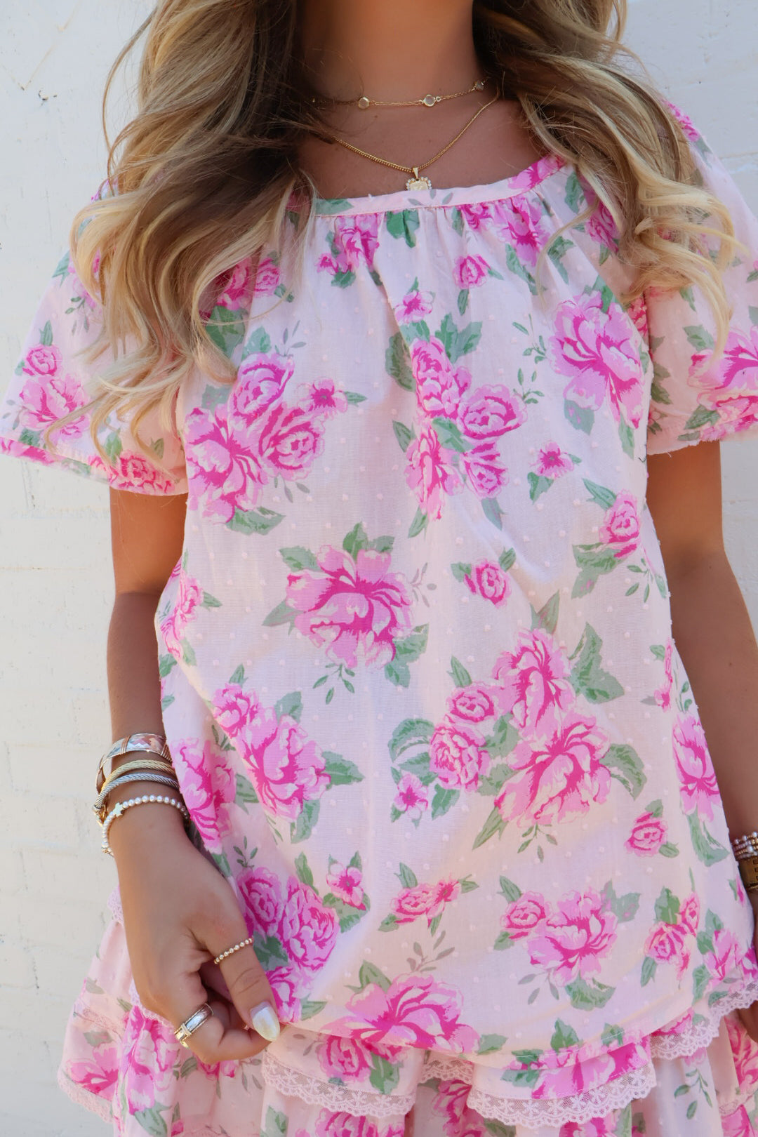 This set is giving all the soft, girly, throw-it-on-and-go vibes—and we’re obsessed! The delicate pink floral print combined with the tiered ruffle skirt creates such a flattering, flirty silhouette that still feels easy and wearable.