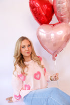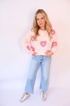 beaded heart sweater, Valentine’s Day sweater, pink heart sweater, women’s Valentine knit, boutique Valentine sweater, embellished heart sweater, cozy Valentine outfit, women’s pink sweater with hearts