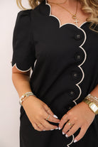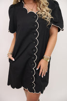 women’s fall dresses, fall black mini dress, chic black dress, boutique style dresses, scalloped trim dress