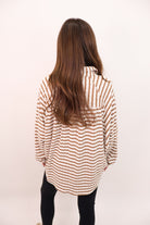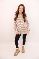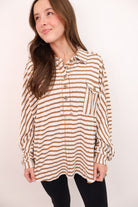 The Textured Camel Stripe Henley Top gives a playful twist to a classic favorite. The slightly textured striped fabric and generous fit make it the perfect everyday piece for layering or wearing solo. It’s soft, lightweight, and has that effortless, slightly oversized drape we all love!