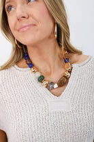 Introducing our Chunky Multi Beaded Necklace - a statement piece that will elevate any outfit this fall! Made with chunky beads in hues of gold, brown, navy and green, this necklace adds a touch of boldness and sophistication to your look. The perfect accessory to make a stylish statement.