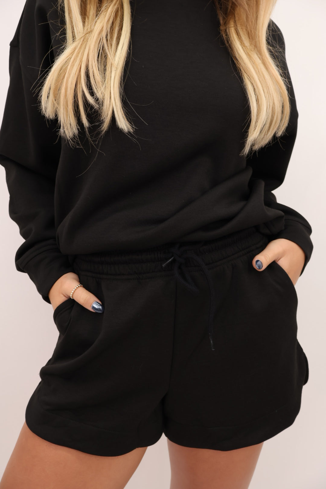 - Matching drawstring shorts with elastic waistband