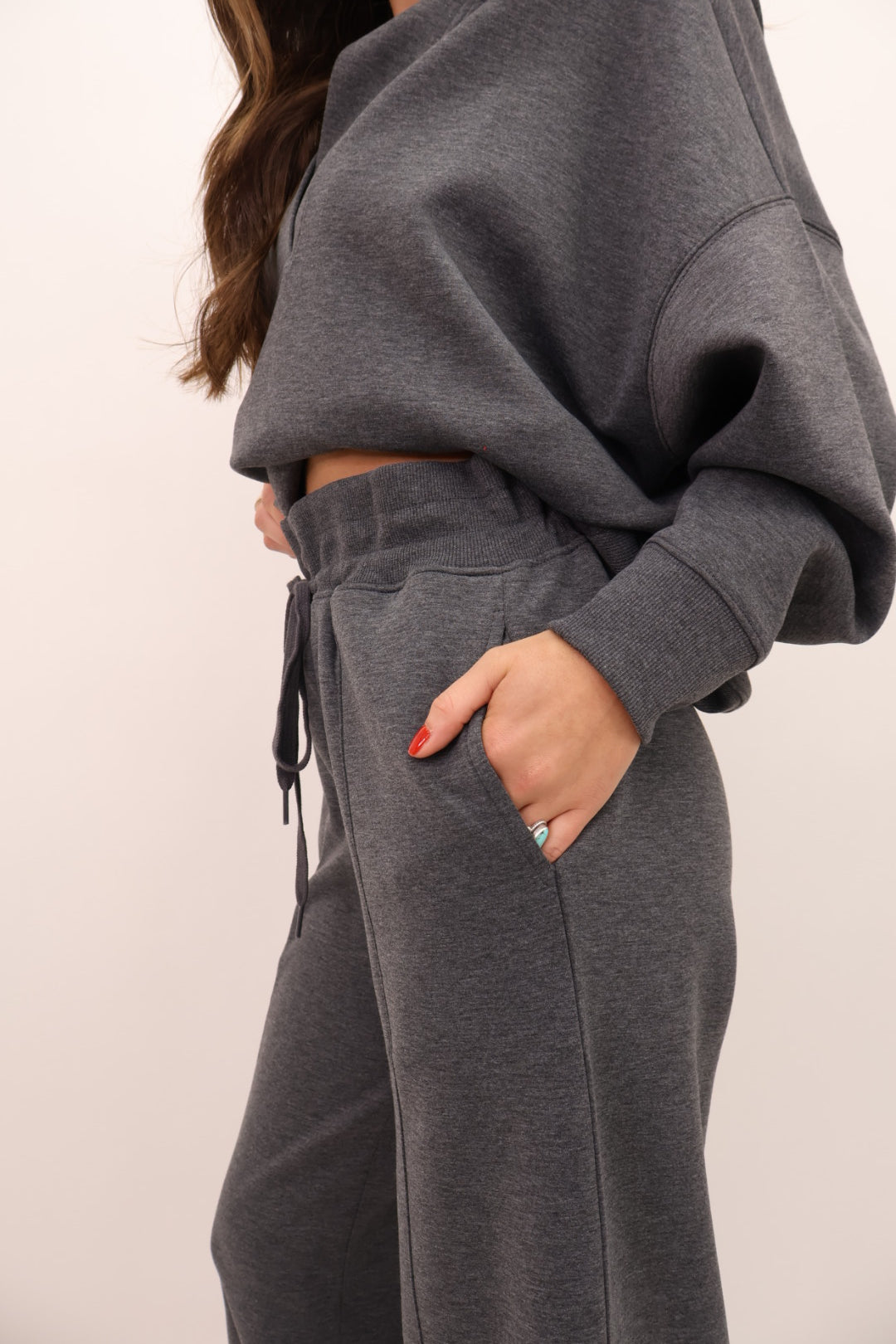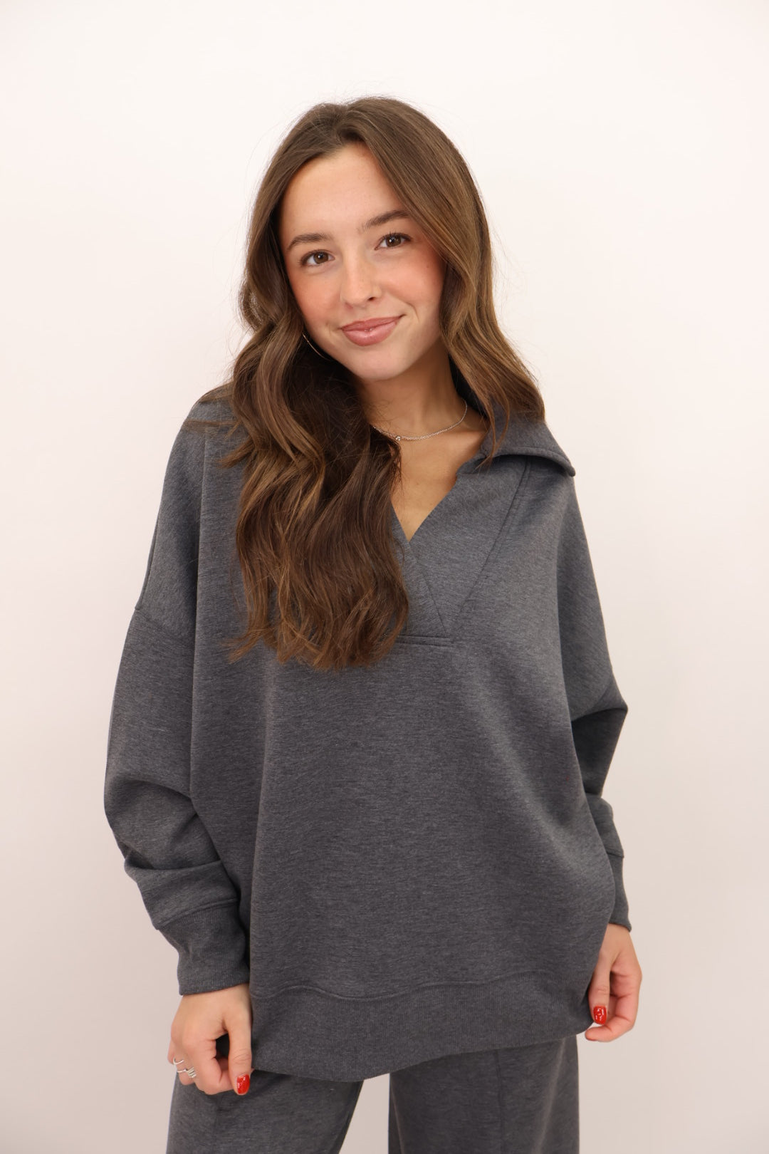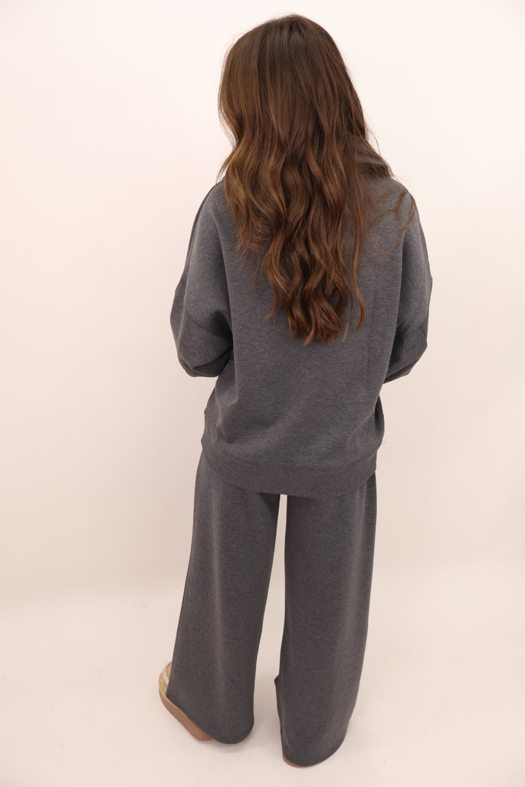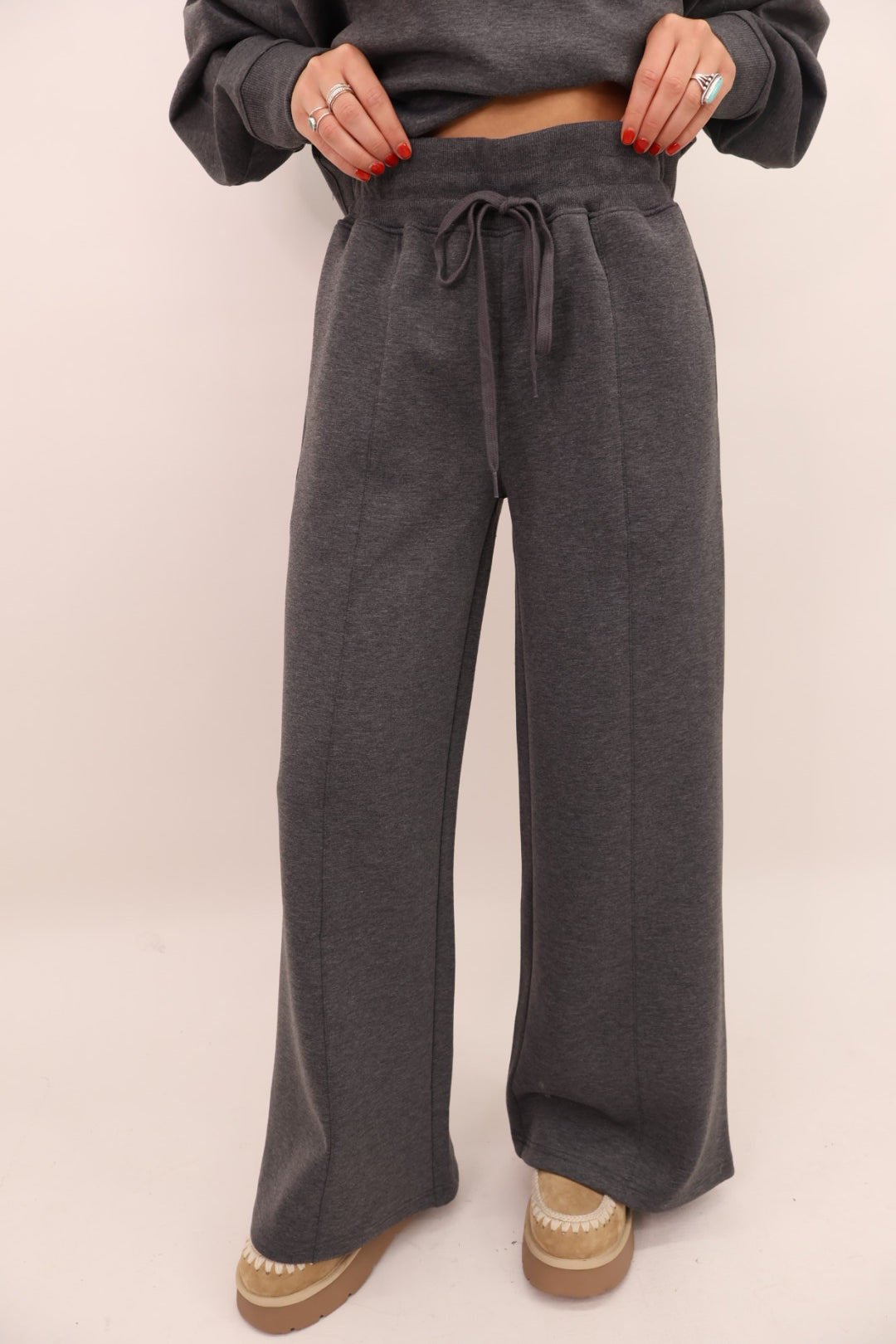 Meet the set you’re never going to want to take off! This unbelievably soft lounge duo was made for slow mornings, holiday movie nights, and every errand in between. The top features a relaxed fit with a chic V-notch neckline that gives it that “put together but still comfy” look you love. The matching pants have a flowy, wide-leg silhouette with an easy elastic waistband + pockets.