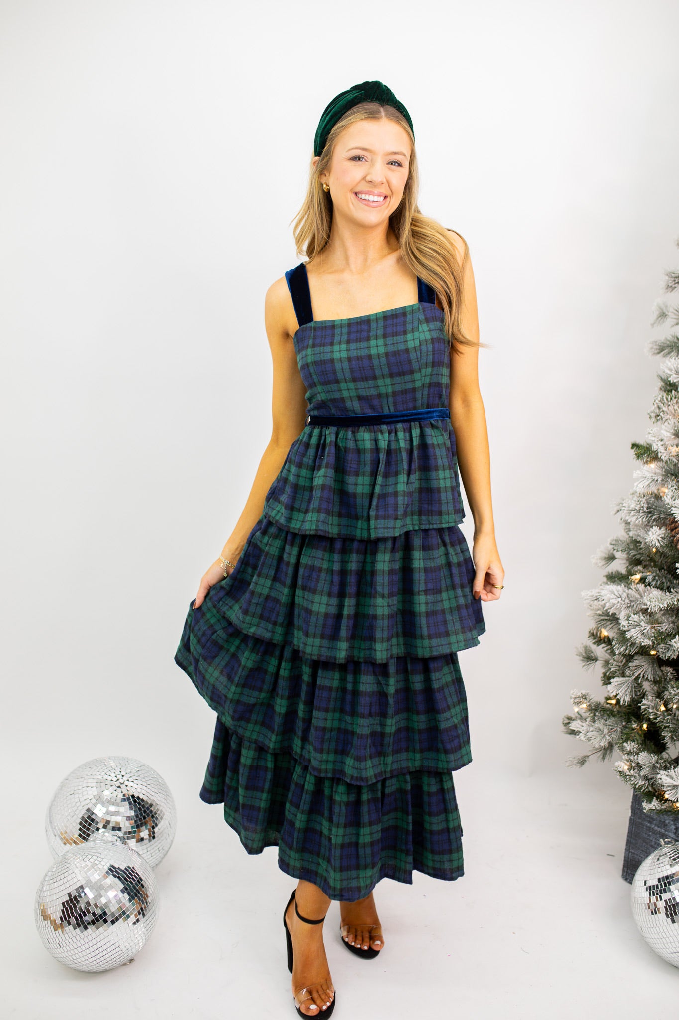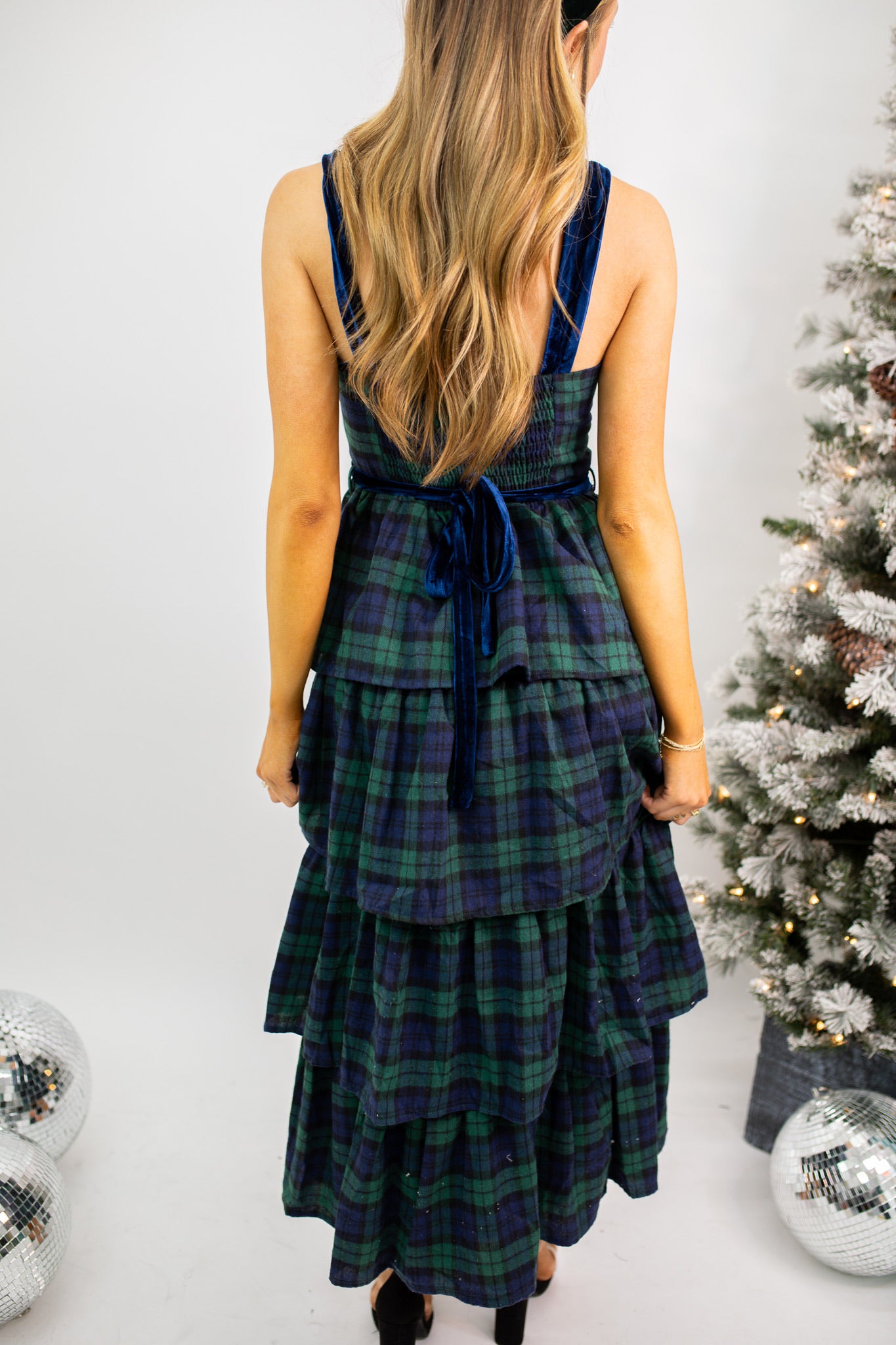 Experience stunning femininity in this dreamy navy and green plaid flannel tiered midi dress! Delight in the details - the velvet straps and velvet sash that can be tied in the front or back - and get ready to turn heads this season!