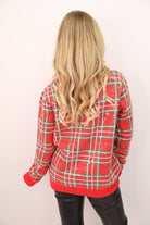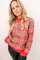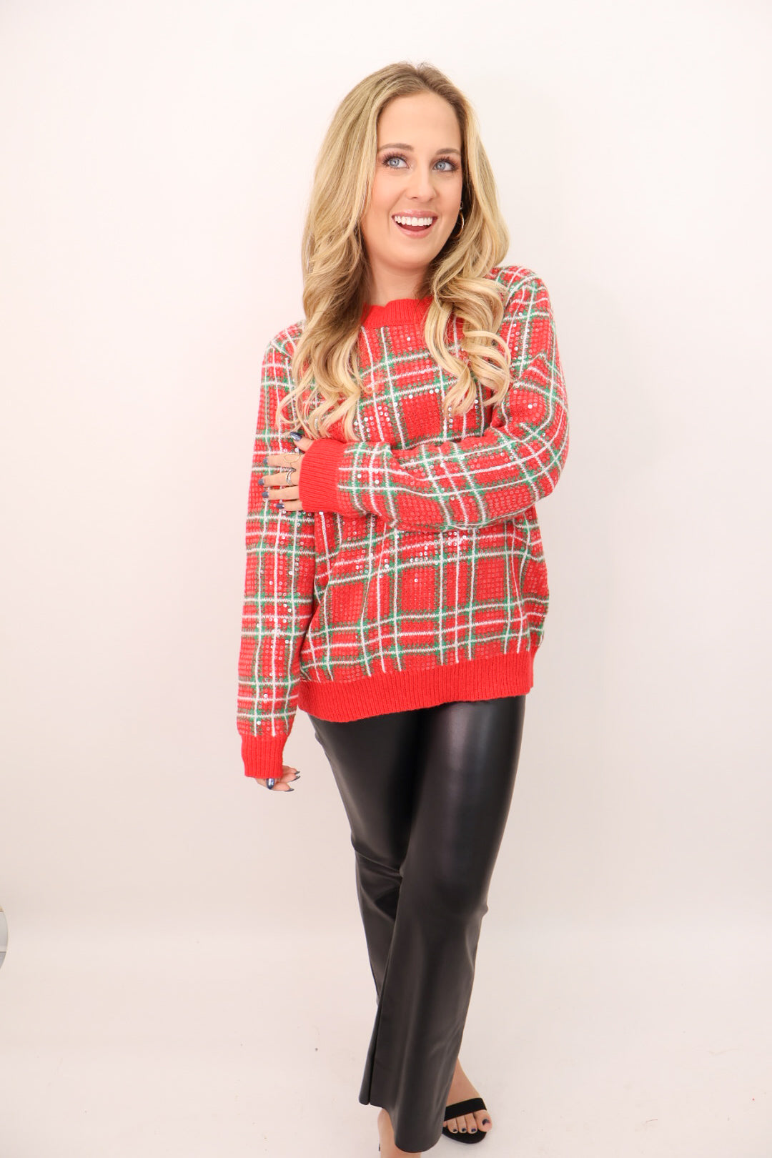 sequin plaid sweater, red green Christmas sweater, holiday fashion, festive women’s sweaters